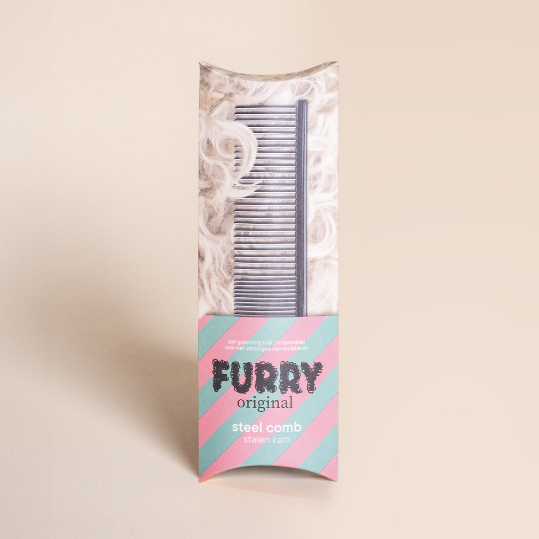 Professionele stalen kam van Furry Original om de vacht efficiënt te controleren op klitten. Door deze kam wordt de vacht zacht en fluffy, wat erg prettig is tijdens het knippen.